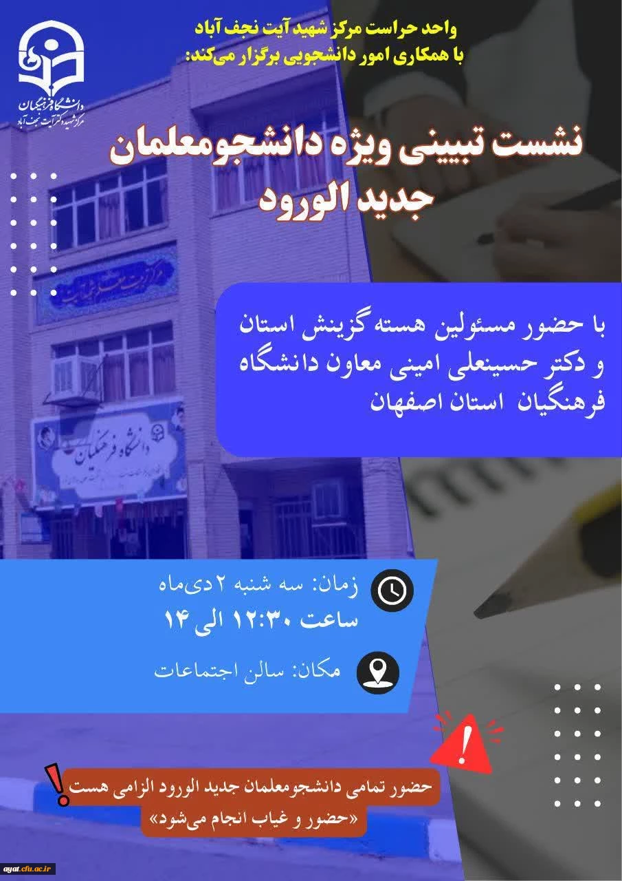 با حضور مسئولین هسته گزینش اصفهان و دکتر حسین علی امینی معاون دانشگاه فرهنگیان استان اصفهان زمان: سه شنبه ۲ دی ماه ساعت ۱۲:۳۰ الی ۱۴:۰۰ مکان سالن: اجتماعات
