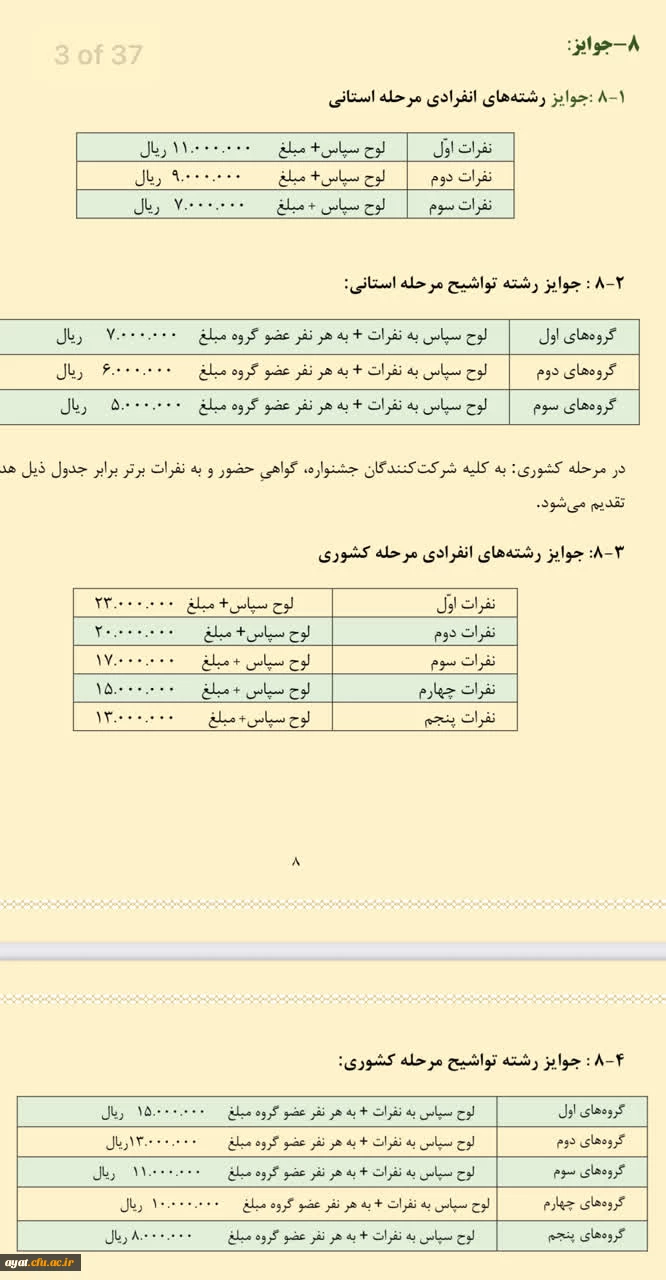 جوایز نفرات برگزیده جشنواره قرآن و عترت رشته های تواشیح استانی و کشوری و در رشته های مختلف انفرادی استانی و کشوری