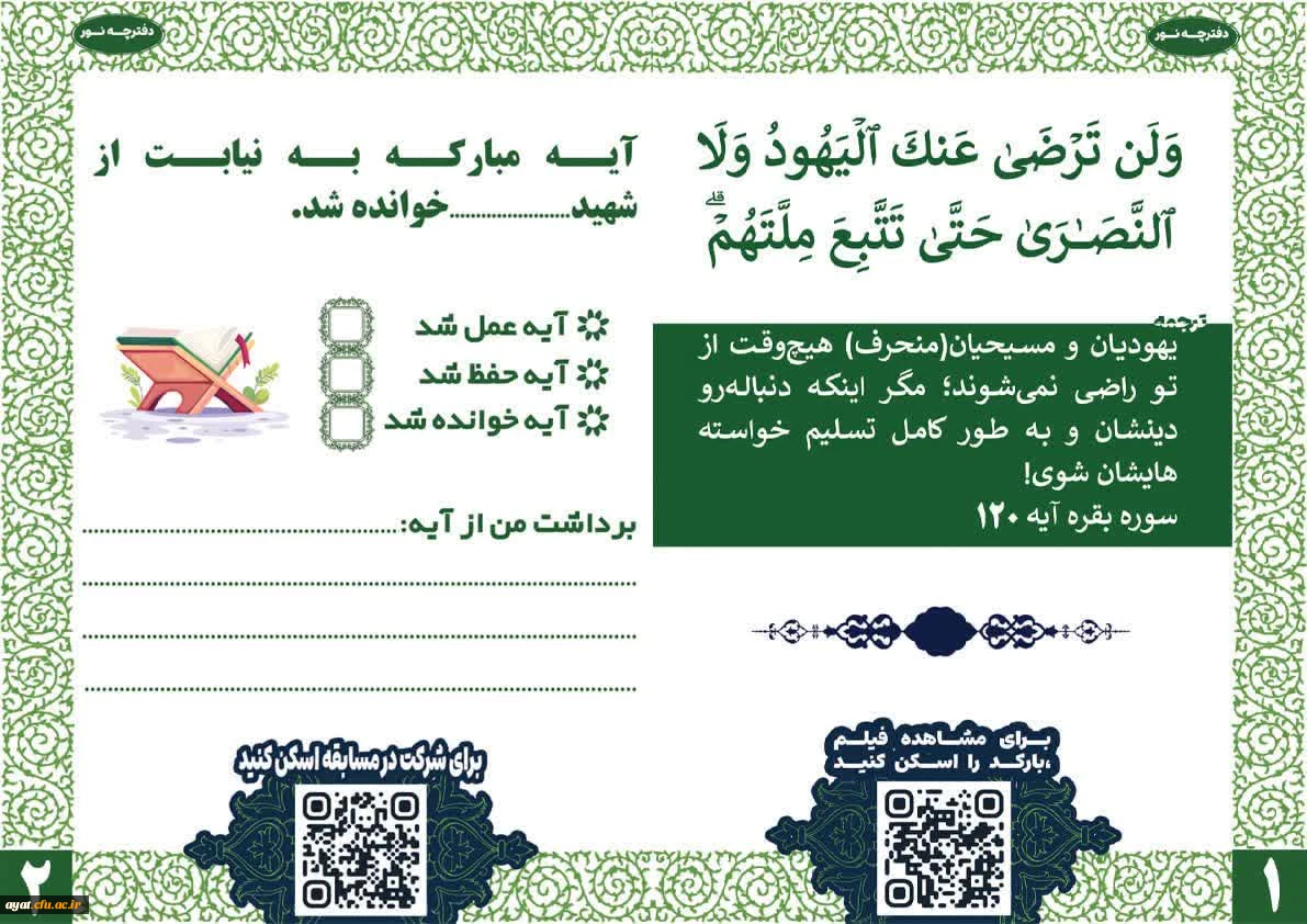 طرز استفاده از دفترچه نور خیلی سادست: صفحه اول رو باز کن، آیه رو بخون و فیلمش رو ببین برای مشاهده فیلم کلیک کنید https://aparat.com/v/utvtn91 صفحه دوم رو با برداشت شخصی خودت از آیه با توجه به فیلم پر کن (هر چی تو دلت اومد، هر حسی که بهت دست داد بنویس) آیه رو حفظ کن و توی روزمره ات عمل کن و در نهایت بارکد صفحه دوم رو اسکن کن و مشخصاتتو توی دیجی فرم ثبت کن تا تو قرعه کشی شرکت کنی برای شرکت در مسابقه وارد لینک شوید https://digiform.ir/w8226d09f