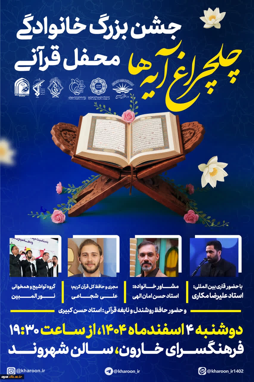 جشن بزرگ خانوادگی چلچراغ آیه ها همراه با تجلیل از برگزیدگان مسابقات قرآن و عترت بسیج شهرستان نجف آباد قرائت قاری بین المللی قرآن استاد علیرضا مکاری و با حضور مشاور خانواده استاد حسن امان الهی ؛بااجرای حفظ توسط حافظ روشندل و نابغه قرآنی استاد حسن کبیری وگروه تواشیح نور المبین زمان : دوشنبه ،۴اسفندماه ۱۴۰۴ از ساعت ۱۹:۳۰ مکان: نجف آباد ، سالن مجلل شهروند